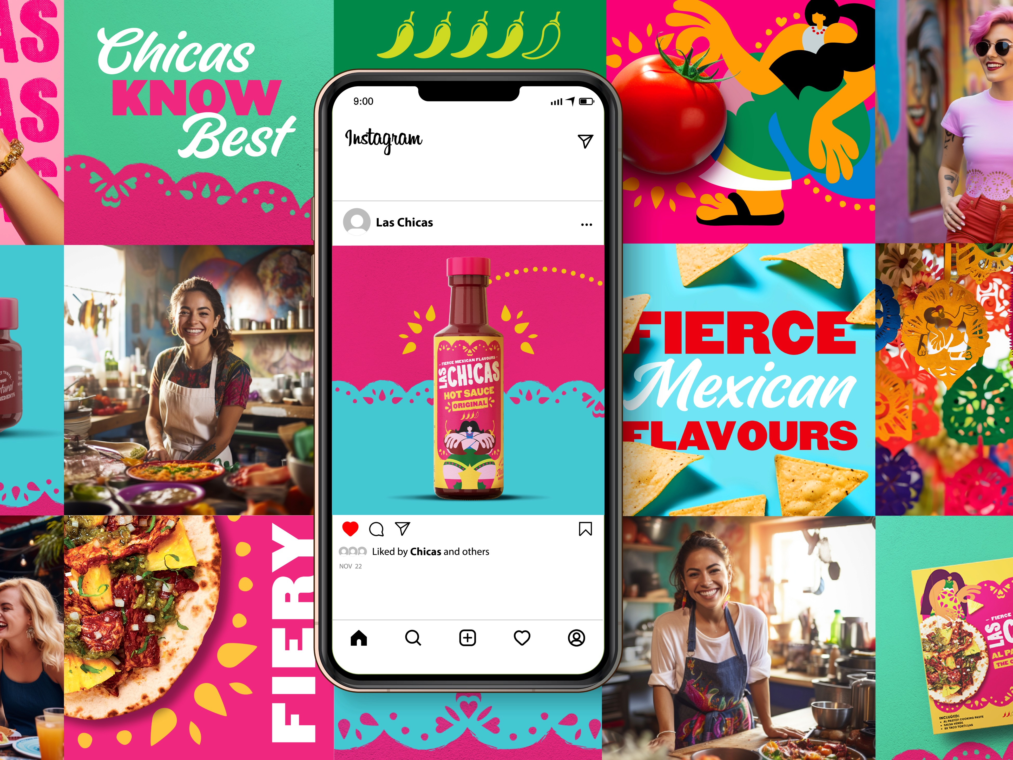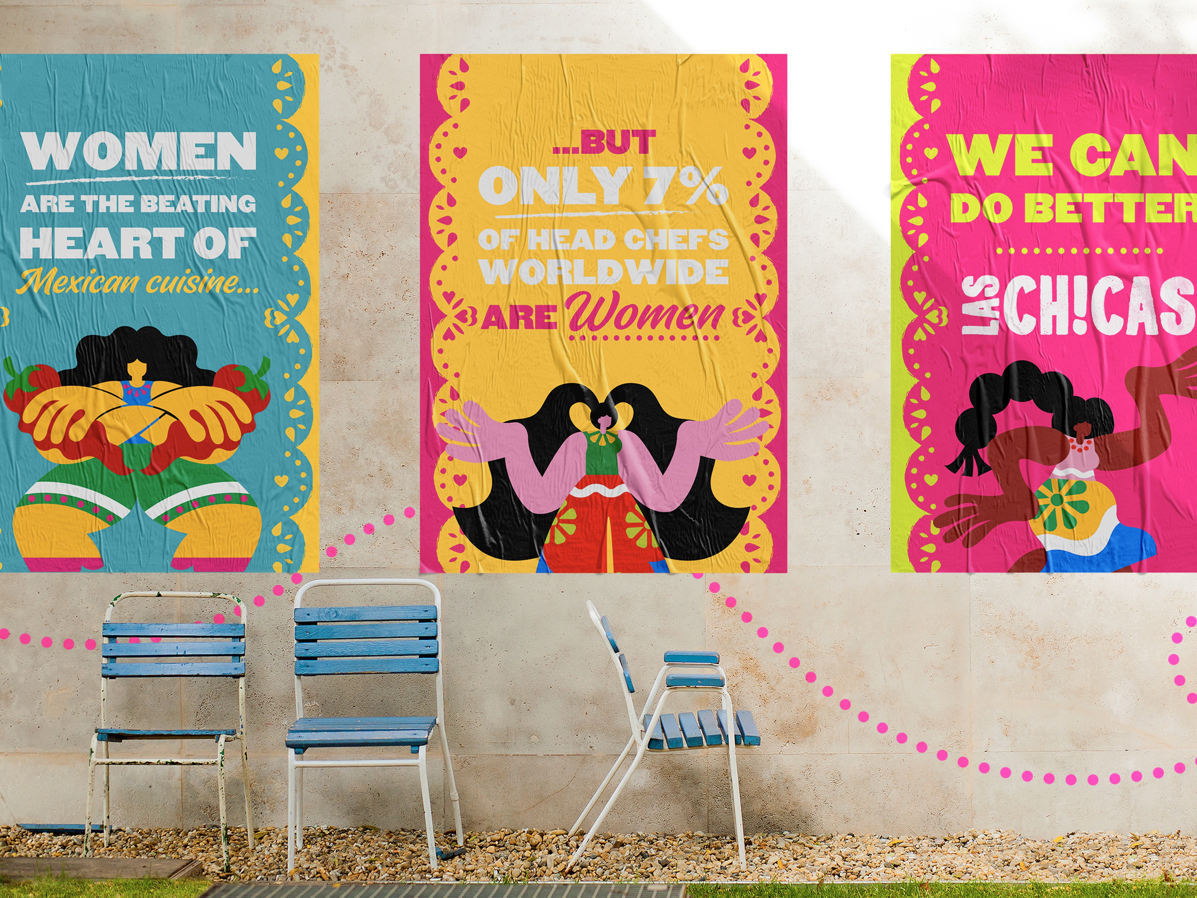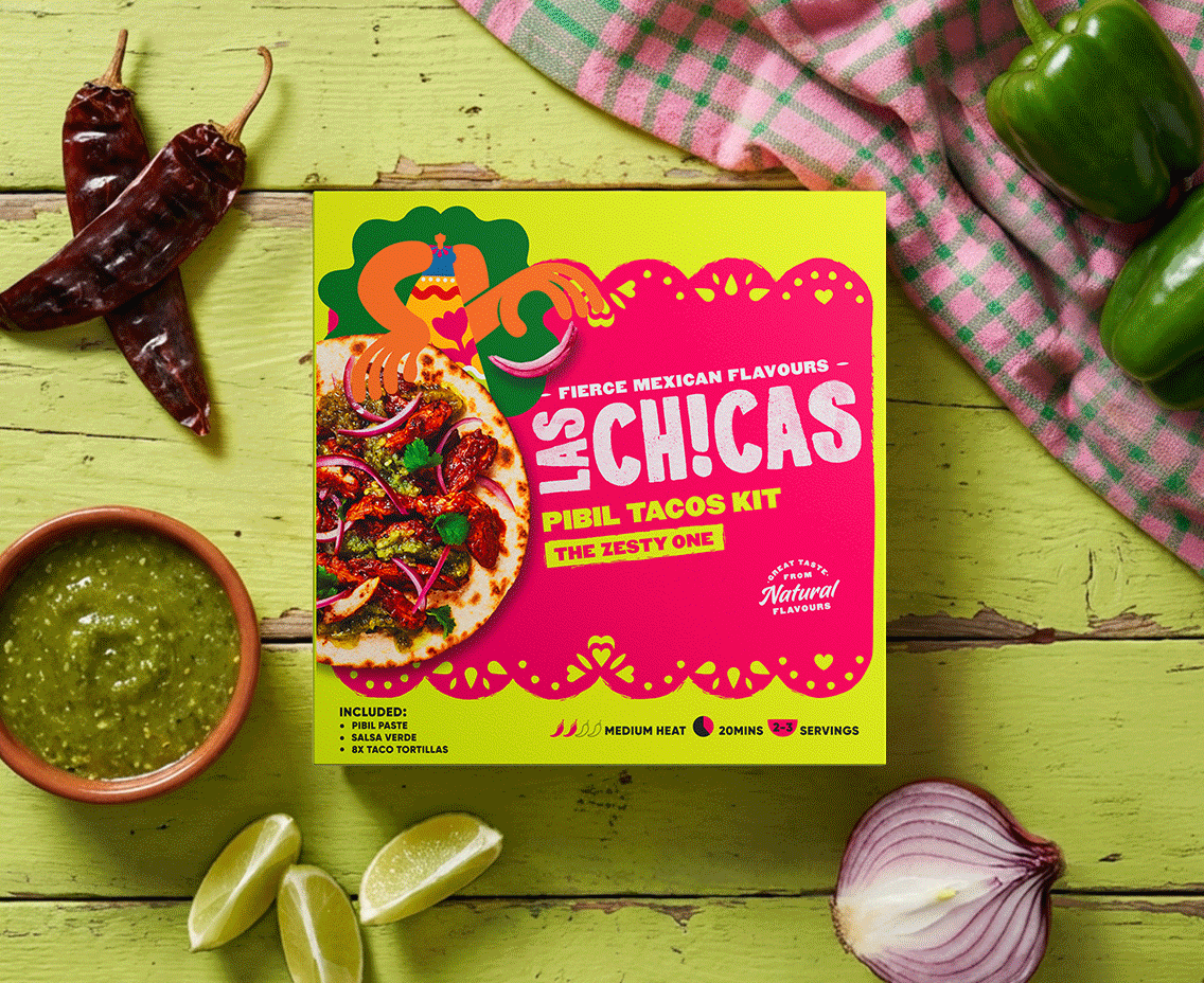 In a crowded, cliché-heavy category, we saw an opportunity to bring a more human, proudly feminine perspective to Mexican cuisine. Inspired by ‘Fiercely Mexican’, we crafted a bold, modern identity that celebrates the spirited mexican women behind the food, with vibrant ‘papel picado’ visuals and illustrations by Mexican artist Ales Ballesteros. A refreshing take that cuts through the noise and challenges tired Tex-Mex tropes.